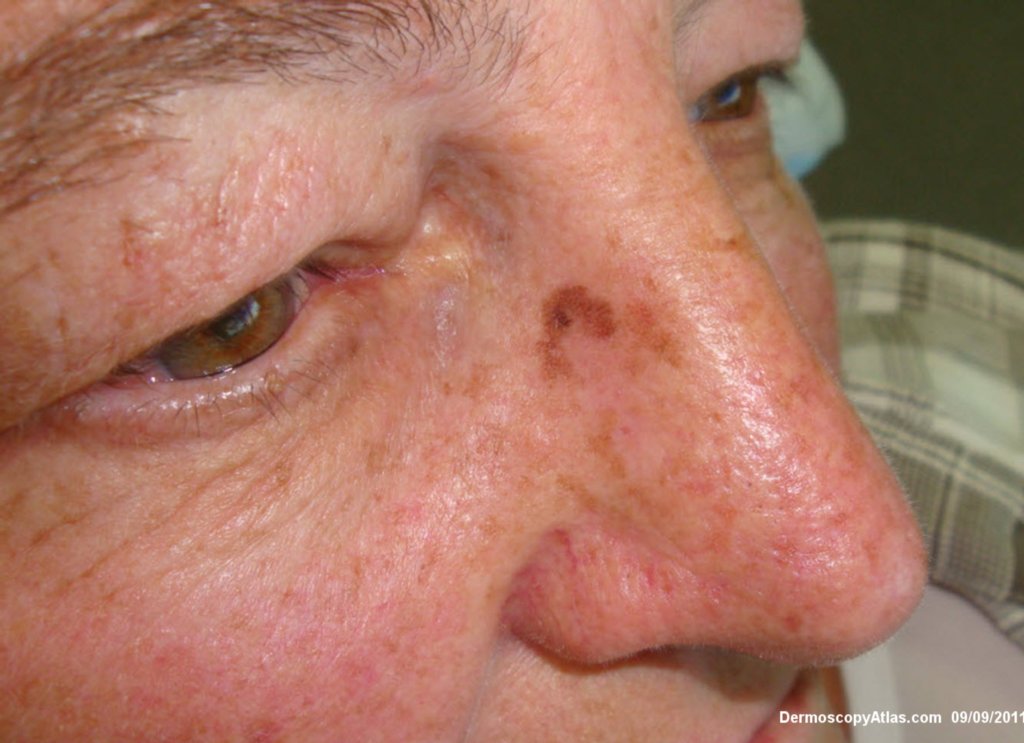 Description: Pigmented lesion on nose showing perifollicular pigmentation, grey circles and lines reticular.