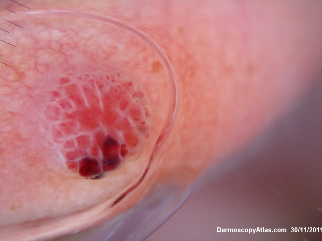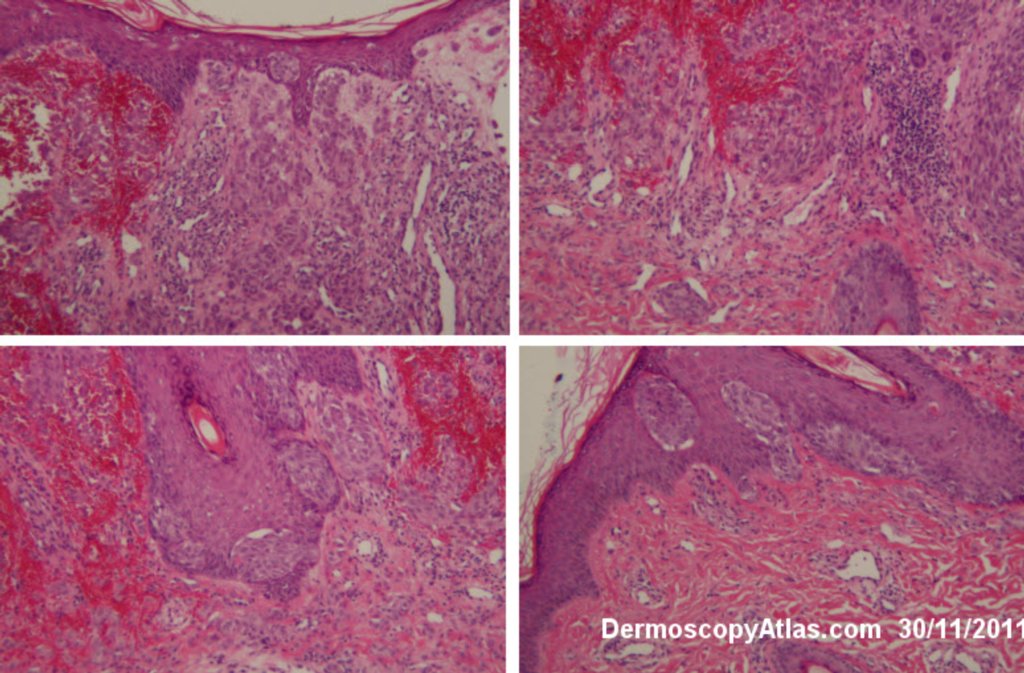 This lesion arose rapidly on the ear of a 5 years old male. The issue was whether it was a Spitz nevus or a traumatised hemangioma. The presence of small vessels within the pink clods ruled out hemangioma. The septae between the pink clods represent the white lines seen in some Spitz nevi. The histology shows a disrupted Spitz nevus with some hemorrhage into the nests and acantholysis. Usually you just see some clefting around the nests in Spitz nevi.