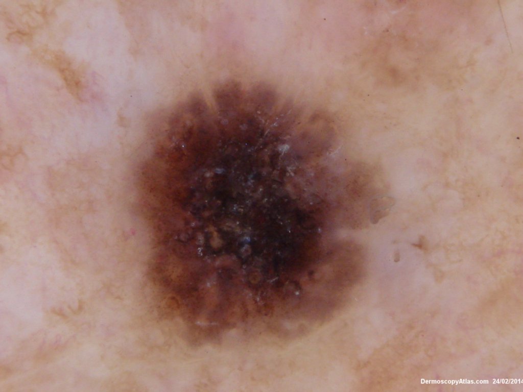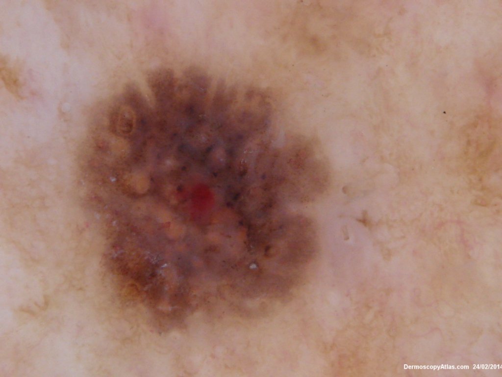 This lesion had been present on the lower leg anteriorly for 2 years. Slowly becoming larger with a densely adherent surface scale. The scale was removed to reveal the underlying dermatoscopic features with different coloured clods and no real network.