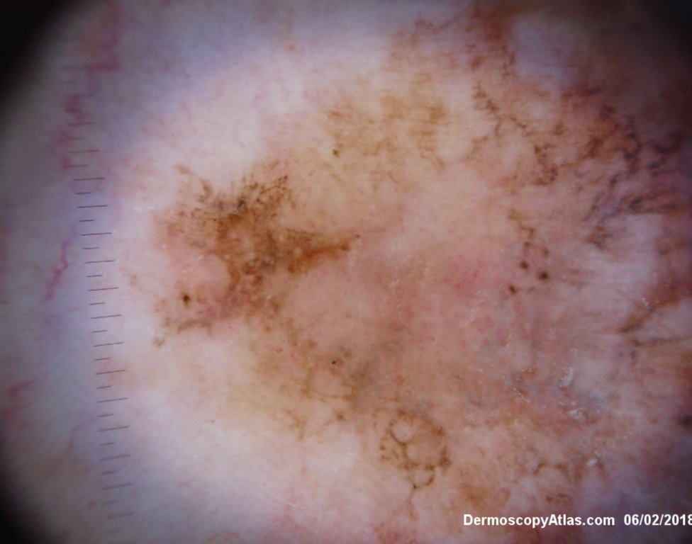 Lady in her early 80s who presented with this lesion on her ankle. The pigmented area had been there for some time but the pink area was bleeding and new. Shave of surrounding area and a punch biopsy of the new pink area showed mainly surrounding in situ melanoma with invasive melanoma in the pink area 1.8 mm thick. Having a 2cms margin excision of the whole area and a graft.