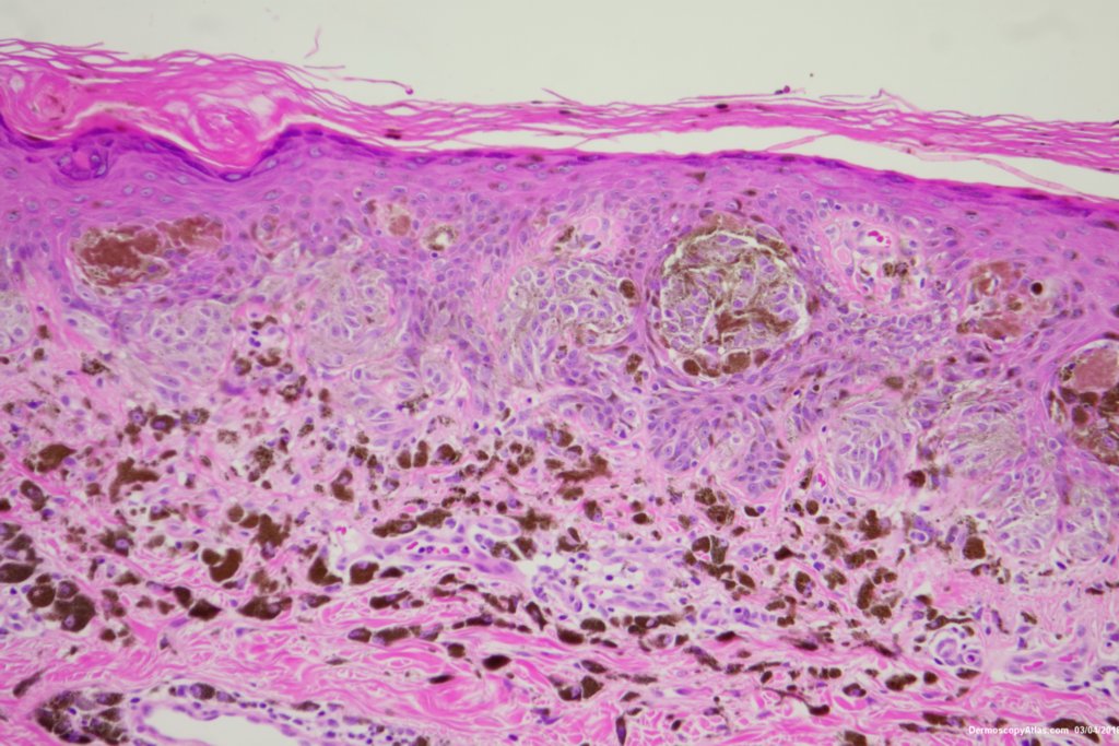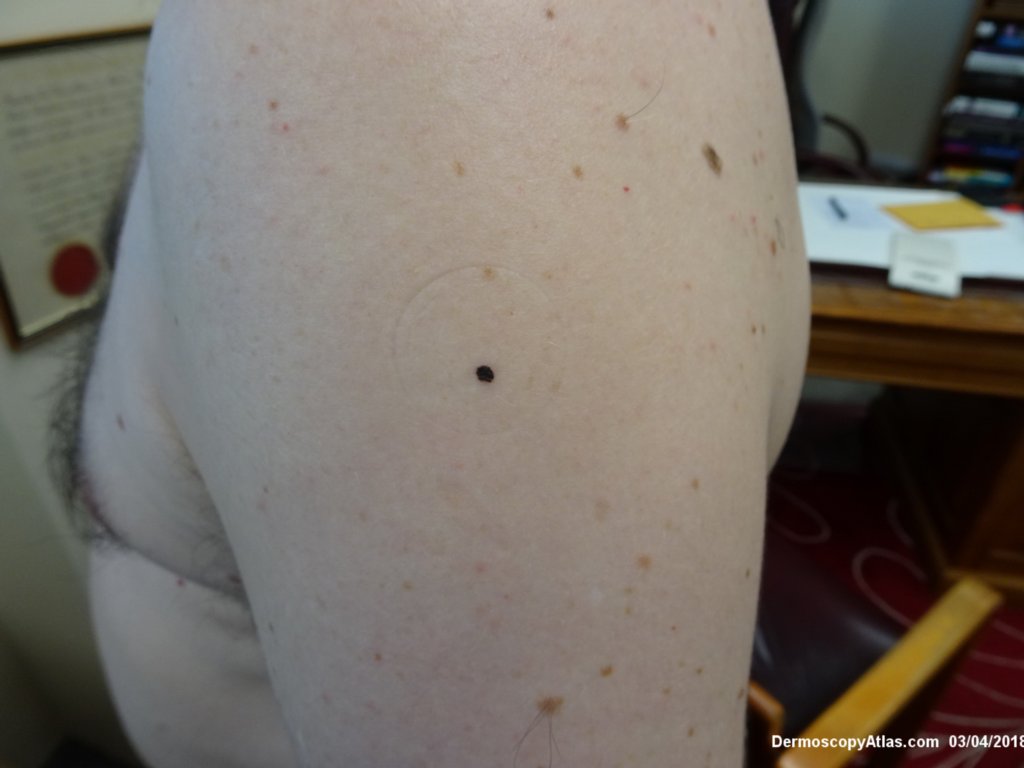 Sudden onset of a new pigmented lesion on the shoulder. Dermatoscopy shows an actively proliferating lesion with peripheral pseudopods that involve most of the circumference. Clinically this was either a Reed nevus or a Spitzoid melanoma. The histology favours a Reed nevus.