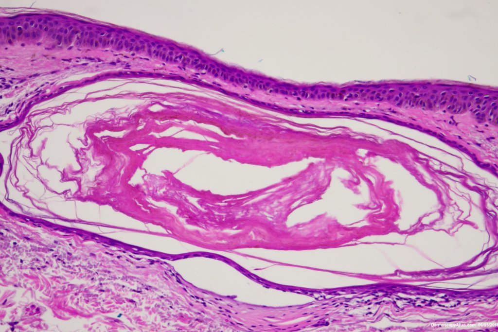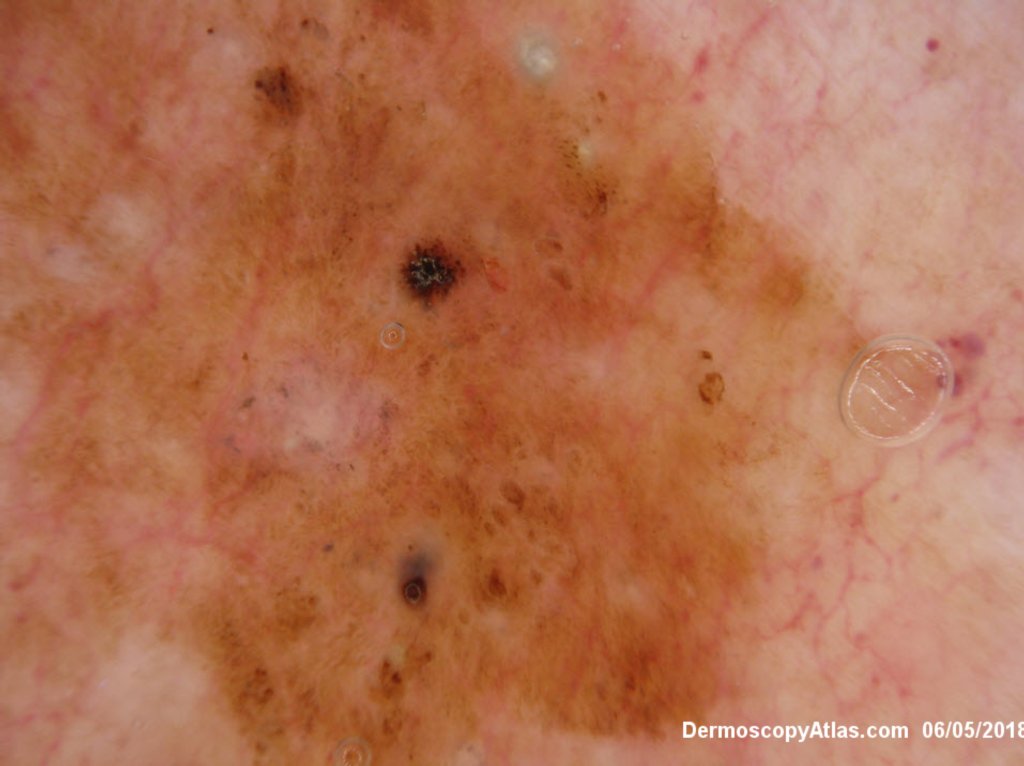 The dark areas within this seborrhoeic keratosis were dark keratin cysts. There is an associated lichenoid reaction at areas.