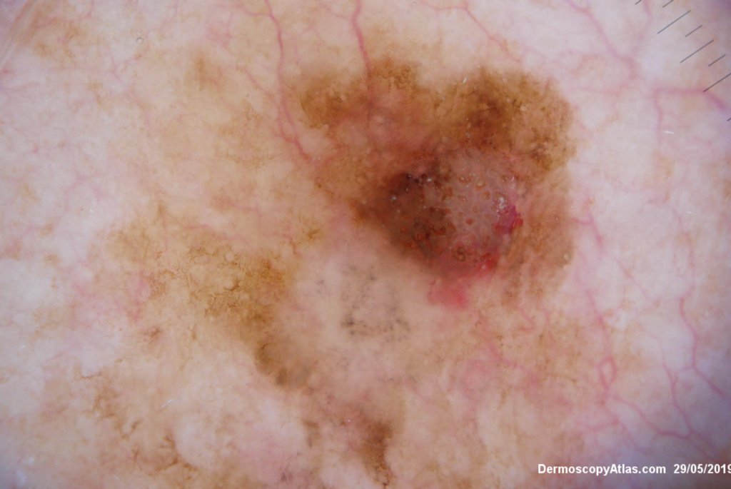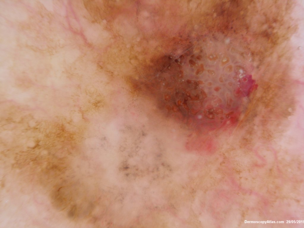 The dermatoscopy shows grey dots of regression and the orange clods in the seb K but there is also some hemorrhage within the Seb k and pigment occluding part of it.