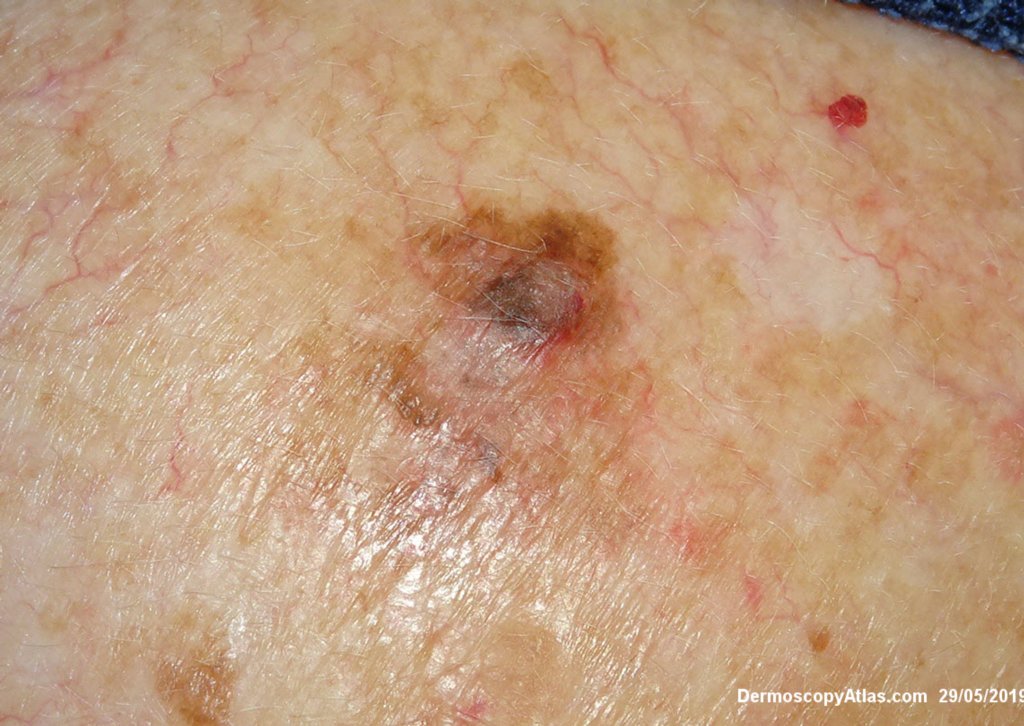 A lesion on the shoulder slowly changing. There are varying colours and the lesion seems to have a seborrhoeic keratosis at one pole.