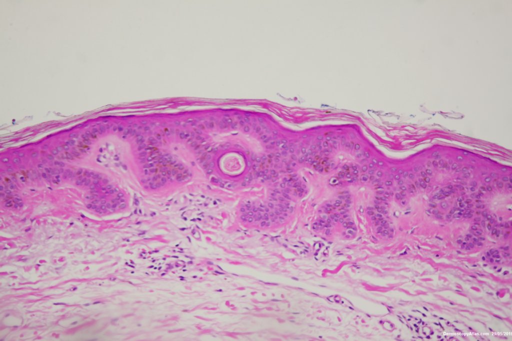 A shave biopsy removing the lesion was done. The histology showed a lentiginous proliferation of atypical basal melanocytes with a lymphocytic infiltrate and some melanin in melanophages causing the grey dots. There was also an in situ melanoma involving part of the seborrhoeic keratosis.