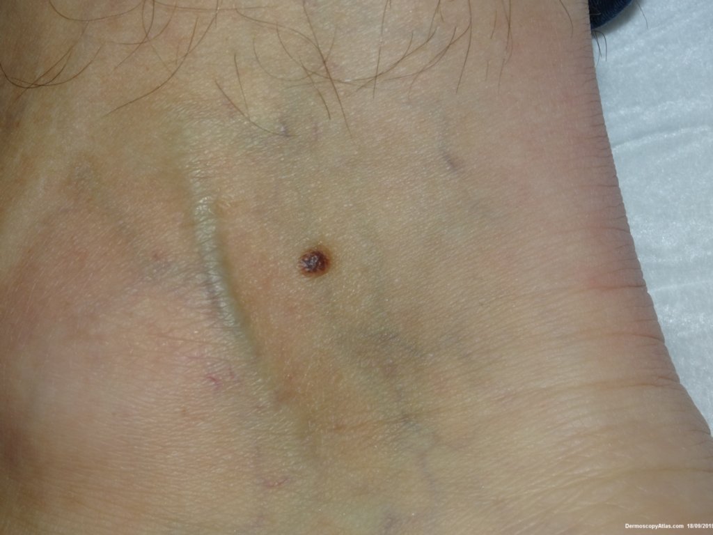 A pigmented lesion on the ankle which showed some grey dots suggesting regression and a slightly thickened network in parts.
