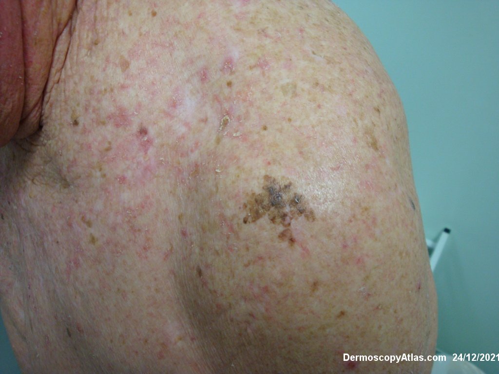 Flat thin lesions can look like a solar lentigo with lines retic or curved and with brown circles on the face with pigment around the openings of hair follicles.