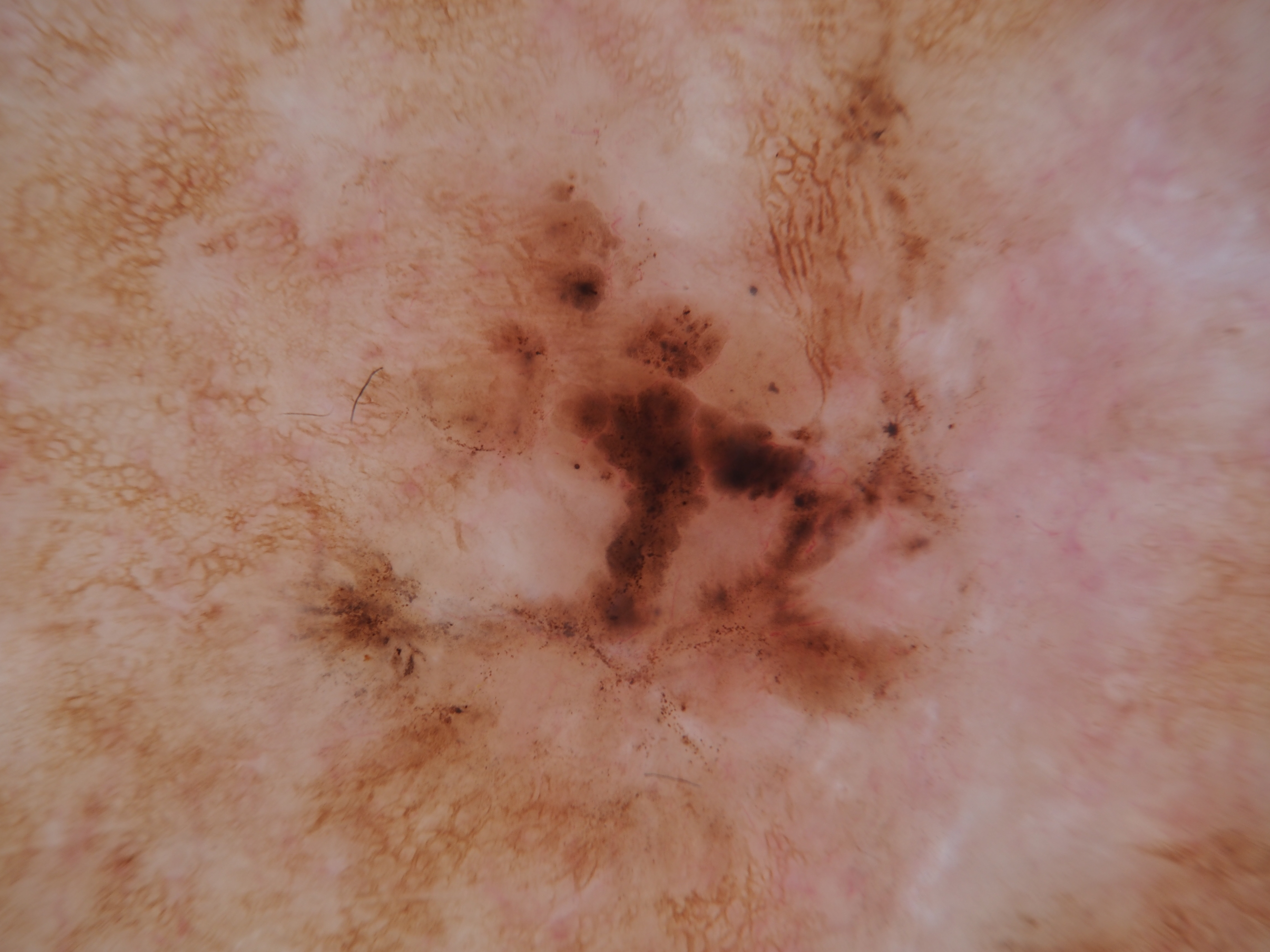 Clod like pattern , no reticular network, straight lines , white and pink structureless areas with brown dots
