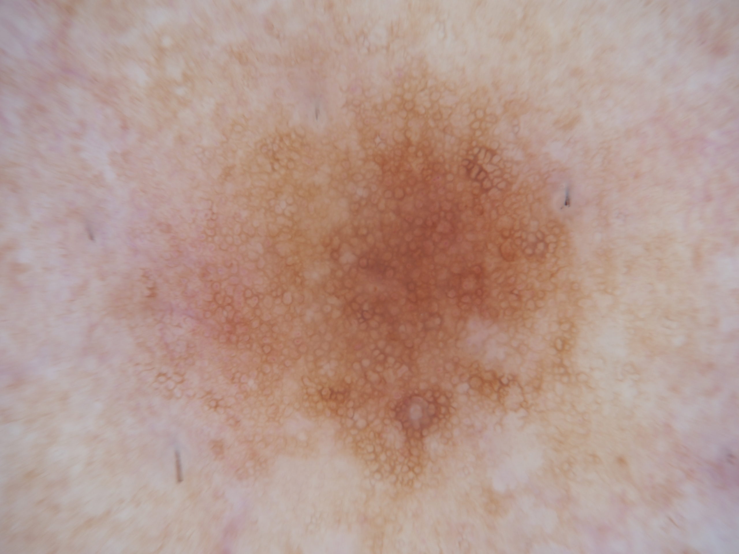 Pigmented lesion on the leg showing a reticular pattern. Clinically this was a dermatofibroma. Usually the reticular pattern is peripheral with some white structures centrally of the dermal collagen but here the whole surface was a reticular pattern. This is seen in about 15% of dermatofibromas.