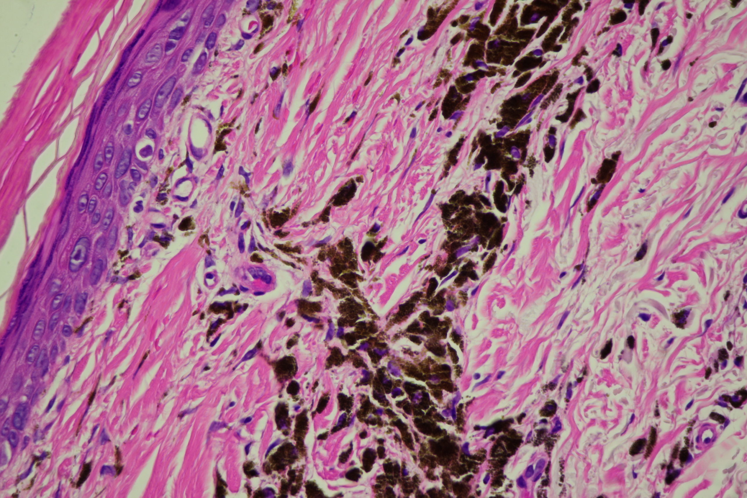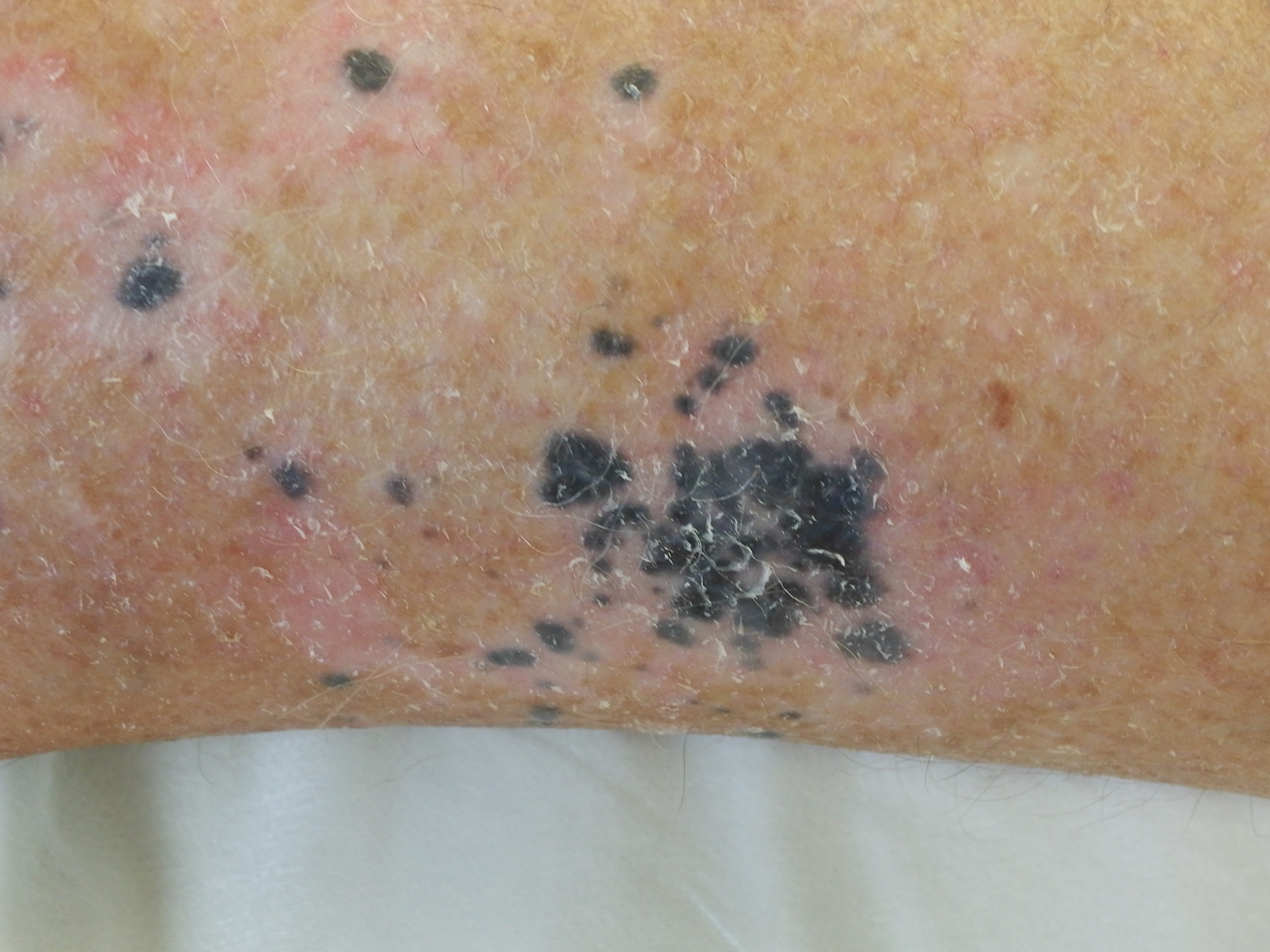 These lesions arose after he went on Check Point inhibitor for metastatic melanoma. Note the perilesional hypopigmentation as well as the post inflammatory hyperpigmentation which was all that was left of his melanoma metastases. These had been stable for the last 9 months with no evidence in PET scans of melanoma elsewhere. This rteally shows the effectiveness of these immune stimulating drugs in metastatic melanoma.