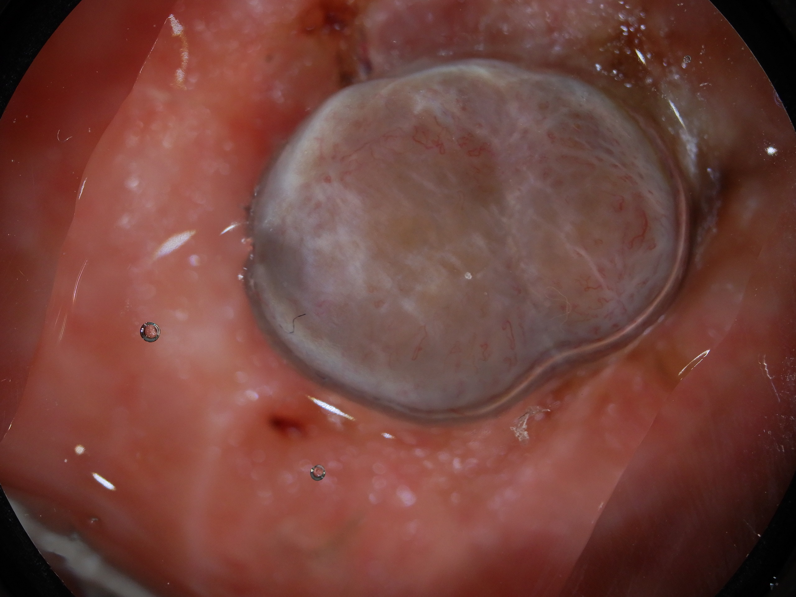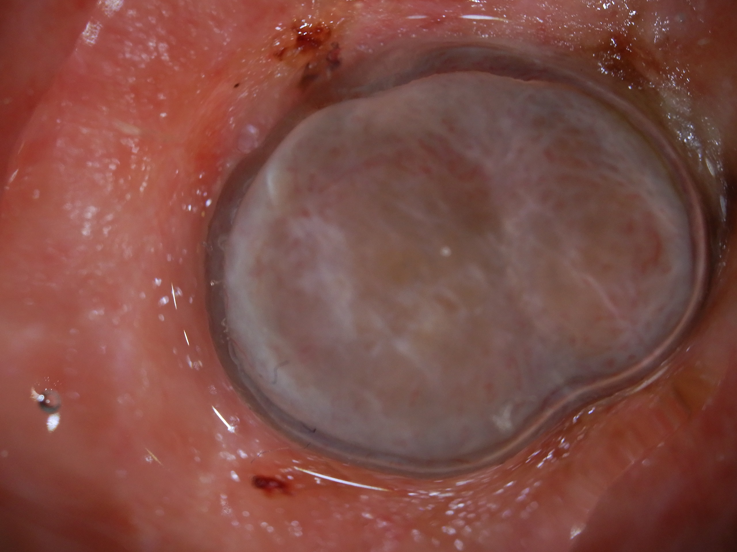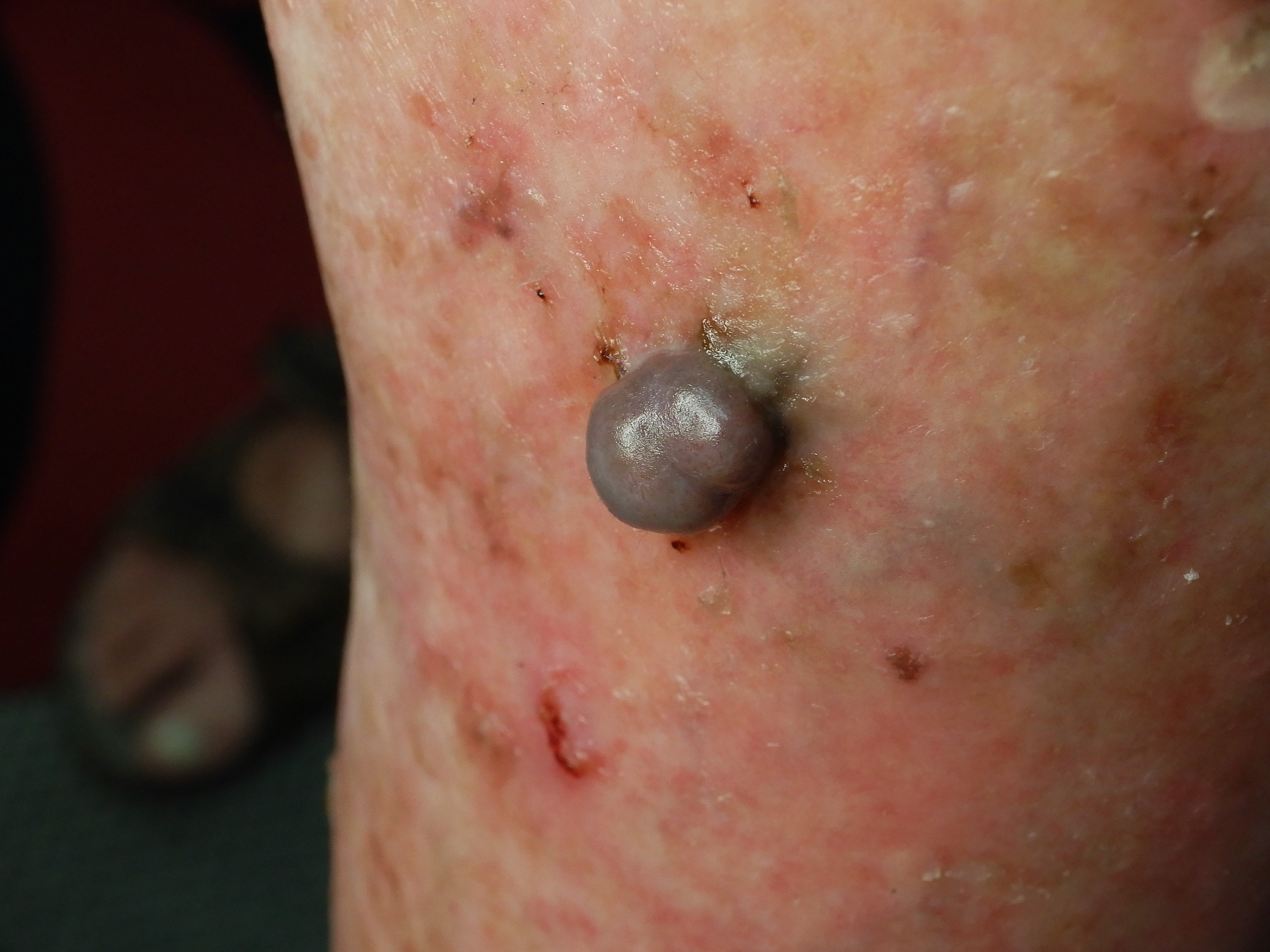 Past history of several melanomas including a blue nevus like melanoma metastasis. Rapid growth over 6 weeks of this blue grey nodule on the shin. No local glands in groin. This was a 6 mm thick pigmented nodular melanoma. Compare it with the previous case.