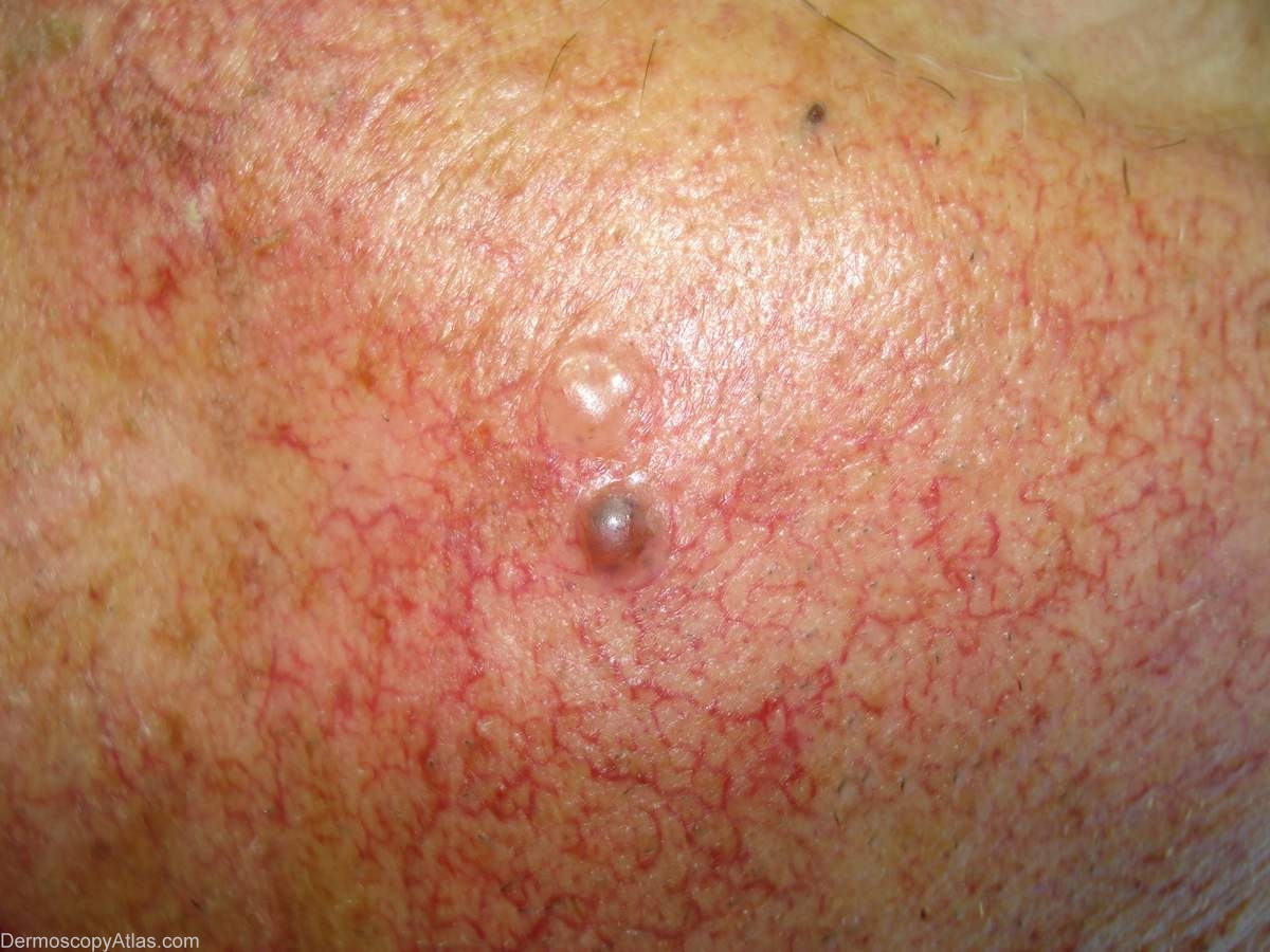 Description: Two lesions on the cheek. One is pigmented while the other shows the more typical features of a BCC.