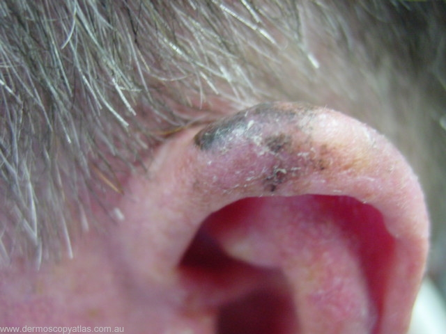 The three features are asymmetry of colour, asymmetry of network and blue or white structures. Each of these counts as one point. Two points or more are suggestive of melanoma and merit cutting the lesion out.