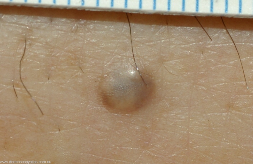 Question: What do you think this lump is? (Consider hemosiderotic dermatofibroma,Nodular melanoma,Blue nevus, Miescher nevus and Glomus tumour)